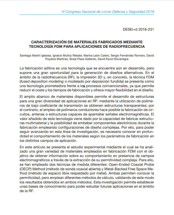 En esta comunicación, se presenta el estudio experimental mediante el cual se ha analizado una gran variedad de materiales empleados en FDM (Fused Deposition Modeling). El objetivo de este estudio es conocer el comportamiento electromagnético de estos materiales. Las probetas fabricadas han sido analizadas mediante la técnica “Open-Ended Coaxial Probe (OECP)” proporcionando información sobre su permitividad eléctrica, a partir de la cual es posible obtener el coeficiente de transmisión. Los materiales con mejor comportamiento dieléctrico fueron sometidos a ensayos de transmisión en espacio libre en una cámara anecoica polivalente para medidas electromagnéticas, BIANCHA (BIstatic ANechoic CHamber), validando de este modo los resultados obtenidos con la sonda coaxial. Los ensayos realizados han proporcionado información relevante para el desarrollo de futuras aplicaciones en radiofrecuencia (RF).